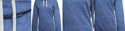 7.25 oz. 60% cotton, 40% polyester melange fleece; Scuba neckline; Contrast fabric on hood, shoulders, and arms; Front pouch pocket; Rib waist & cuffs;